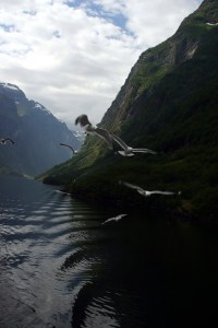 Some well-meaning but idiot tourists on our boat kept feeding the seagulls that were flying around us. While it did make for some nice photo ops, I vowed to stomp on the bird guy at the first sight of seagull poop. Some of these pushy tourists tried to worm their way into our space but we held tight to our real estate and got excellent photos during the entire three-hour cruise. Once we docked in Flam we had a couple of hours to eat, shop, and play. If you take this cruise/trip you can make plans to stop off overnight at any of these places and take extra fjord tours, or go hiking, or partake in some of the other activities available.