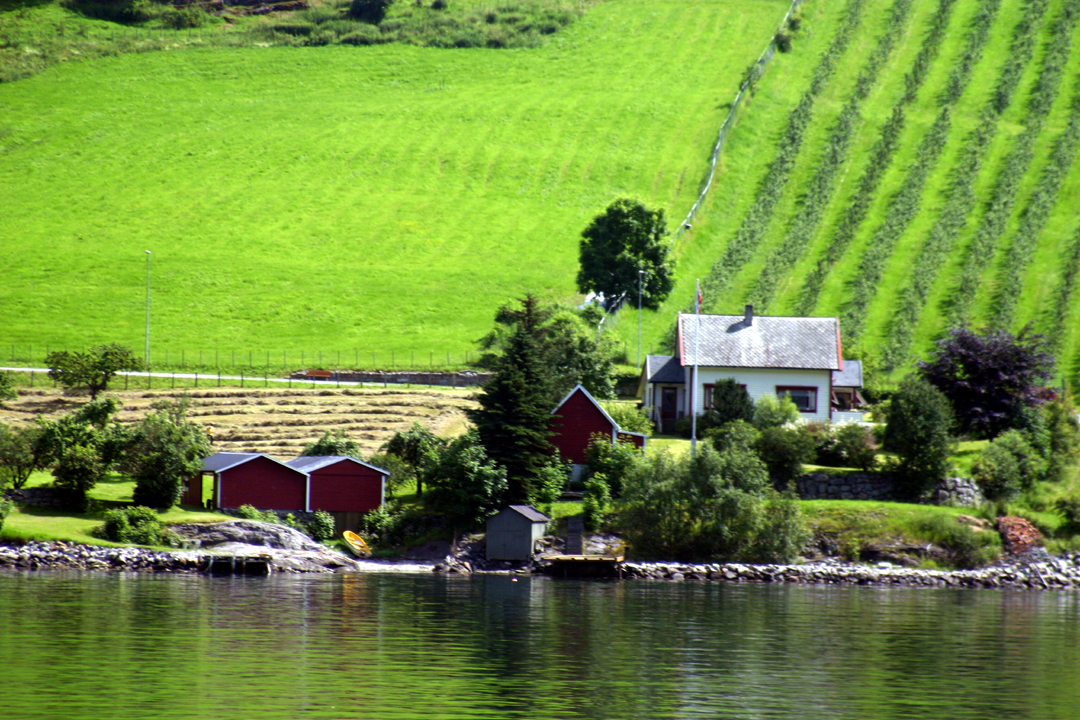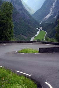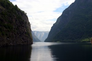 First thing in the morning we hopped on the train out of Bergen. If you’re traveling this way you may want to consider going light on the luggage. Or finding a hot dude to travel with who can lug it around for you. But all was okay and there was plenty of room to store the bags and get great views of the fjords and mountains. At the quaint town of Voss, we changed over to a bus. They were short on busses but these Norwegians know how to move fast and a driver was found tout suite (yes, that’s French but it sounds better than “gang,” the Norwegian word for right away) and a bus showed up for the rest of us who were out-elbowed by the others. The bus drive to Gudvangan took us through some even more picturesque countryside. (I love saying Gudvangen, it’s fun and rolls off the tongue. You should try it.) The real fun was the harrowing sharp, hair-pin s-turns down the steep mountain side. At the bottom of the hill the driver told us to breathe and we all laughed because we actually were holding our breaths. Now off to catch the boat.