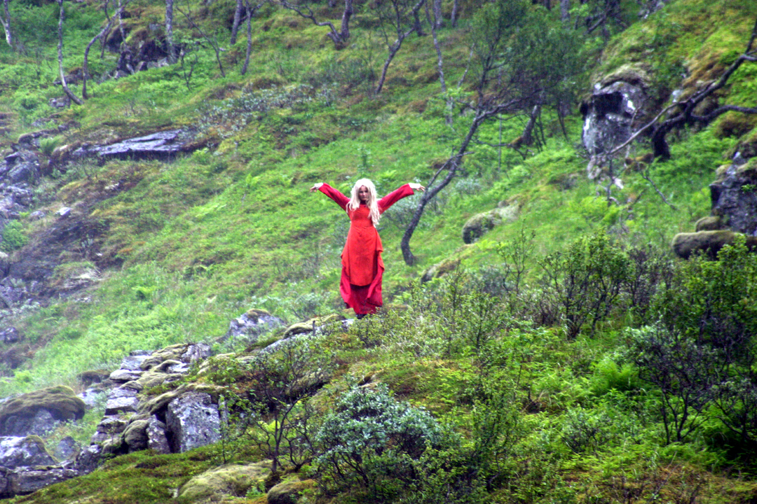 The next segment had us back on the train and up, up, up the mountain. We stopped briefly at a waterfall. Suddenly, some Celtic-like music started blaring out of speakers somewhere and a woman appeared out of the remains of an old stone house. As she danced around the falls and house she seemed like some kind of witch. It was pretty cool. At the top of the mountain, I bought a $13 cup of beer while we waited for our next train on the Flam railway.