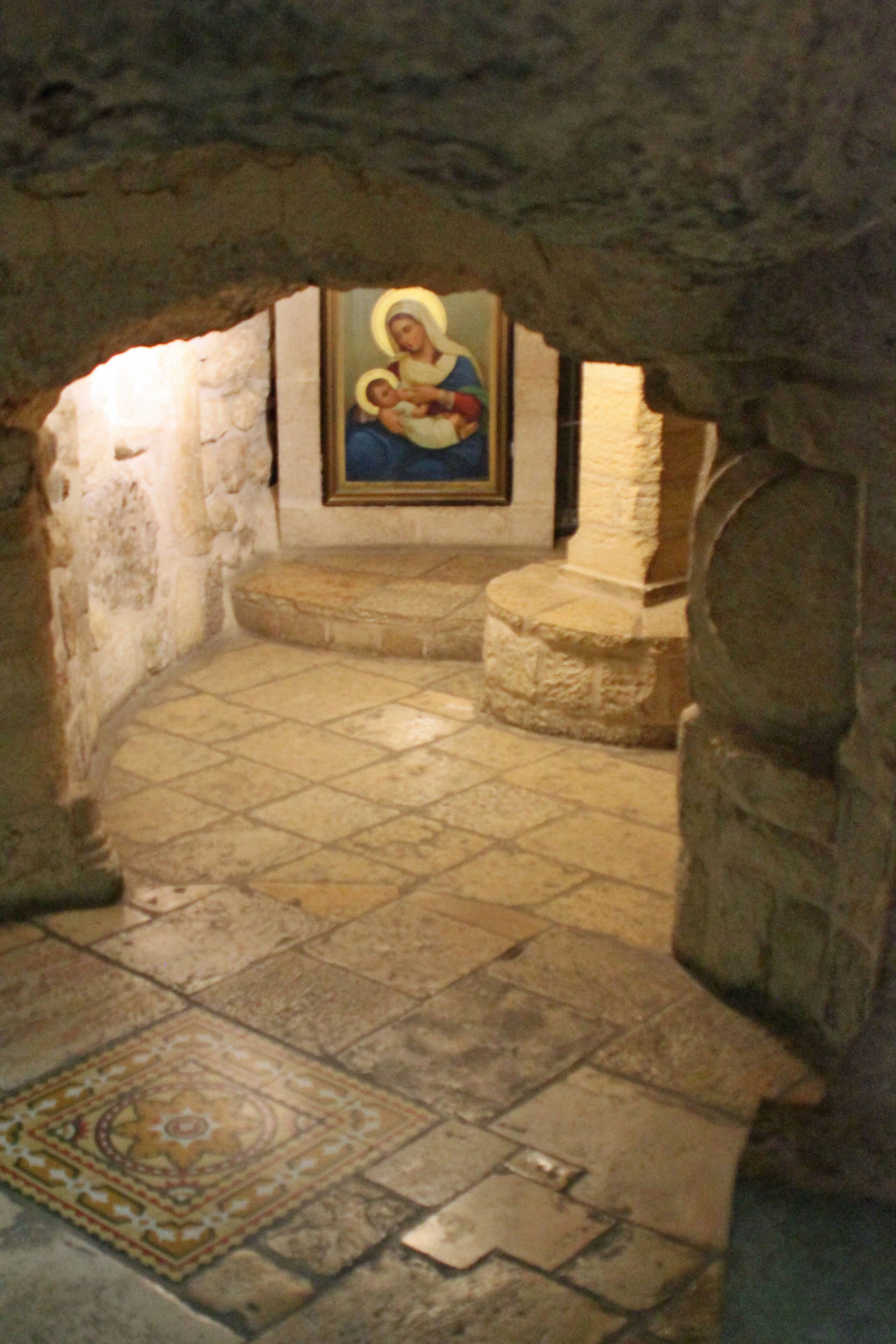 We waited in line to descend steps into a small area where there was an altar above the place where Mary gave birth to Jesus. The walls were covered with thick tarp and there was another altar where a couple of priests were offering communion to a few visitors. We took our turn and bent down to touch the rock under the altar. I lingered for a few minutes wanting to breathe in the Holy Spirit and to try to meditate about this holy place and what happened there 2,000 years ago. But alas, with a tour group, we were moved along to walk through the church. Below one area was a cave where the holy family lived for a time and where Saint Jerome spent time meditating and translating the bible into Latin (the first time that was done).