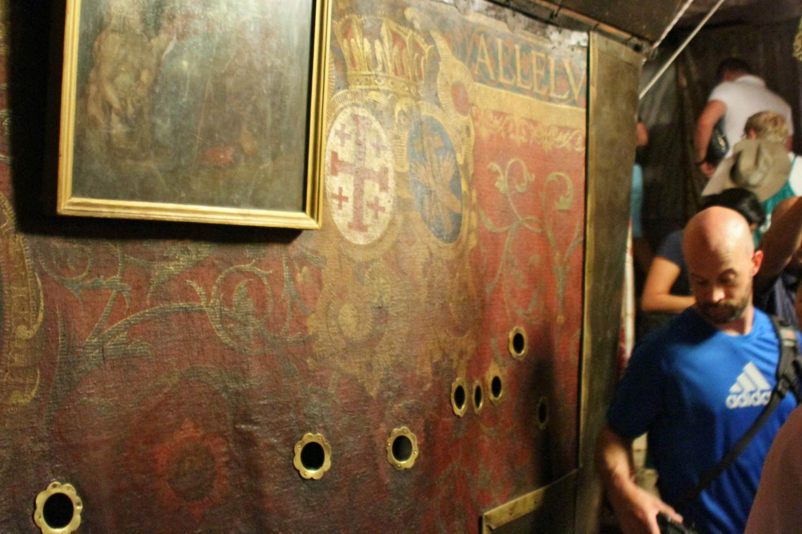 Down in the cave on the walls around the rock under the altar where Jesus was born, tapestries and paintings hung.