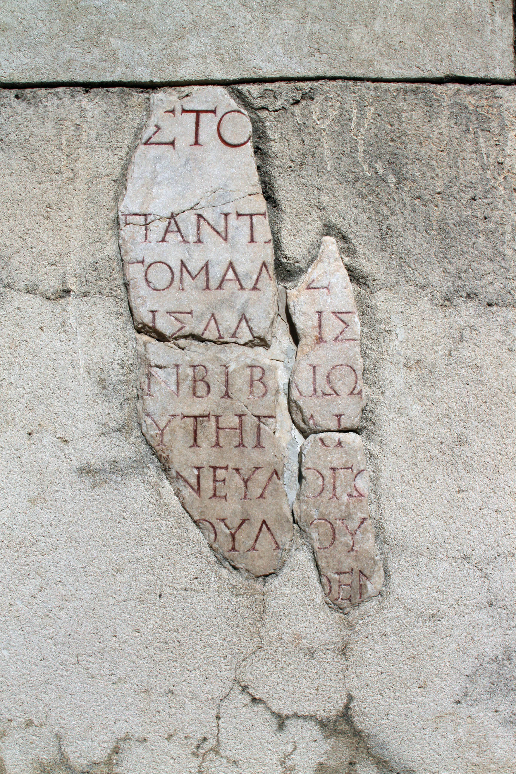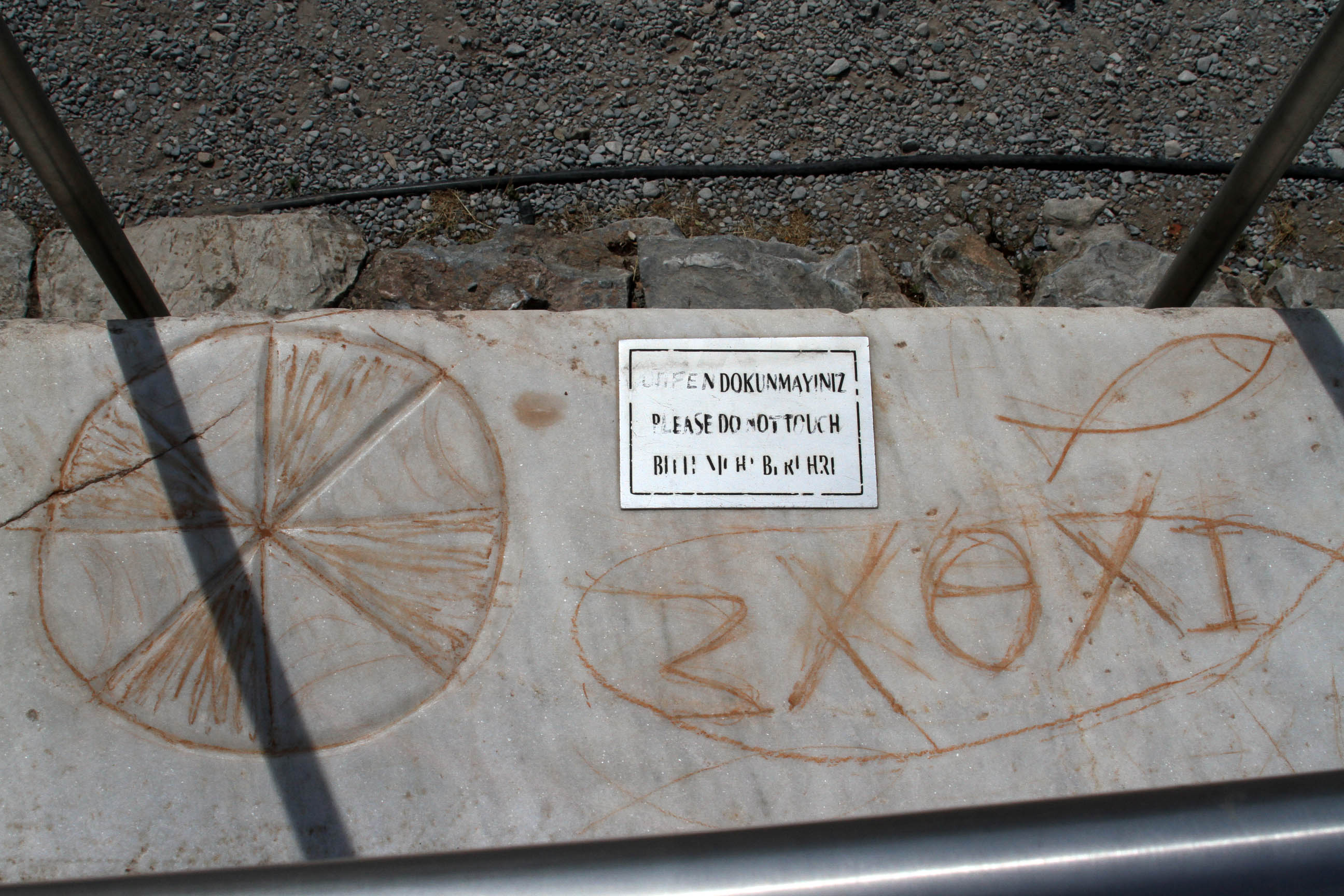 My dad and I went on an excursion and toured the ruins. We started at the top of the hill between two large slopes where there were ancient baths and open areas filled with rubble. We spotted ancient markings in the marble where Christians would leave “notes” for others and to avoid persecution. We were led through pillars that created a sort of entryway to a wide and smooth marble road that led down the hill. We had to be very careful not to slide on the stones that had been worn so smooth by millions of visitors. This was the point where the chariots could go no further into the town.