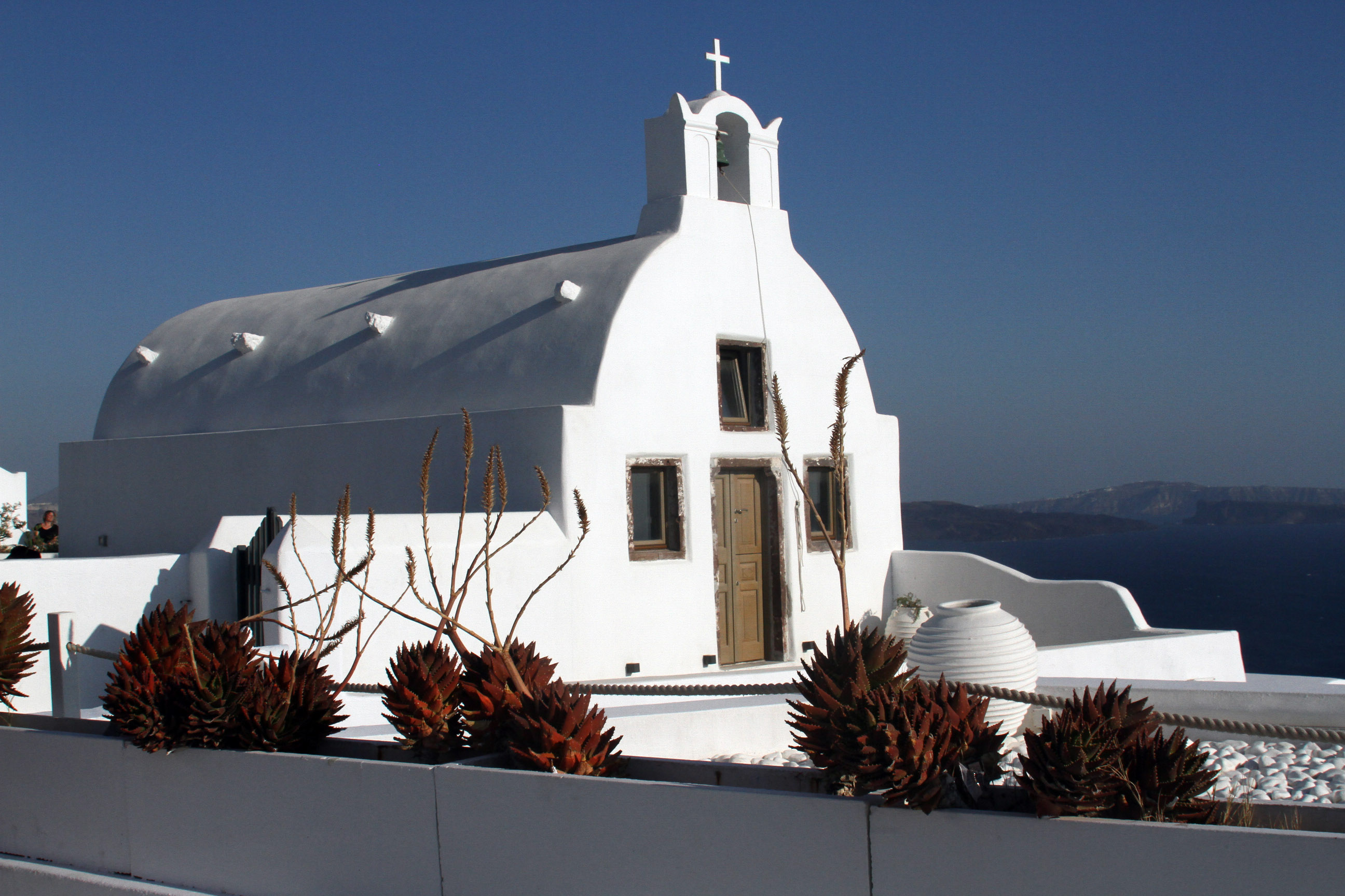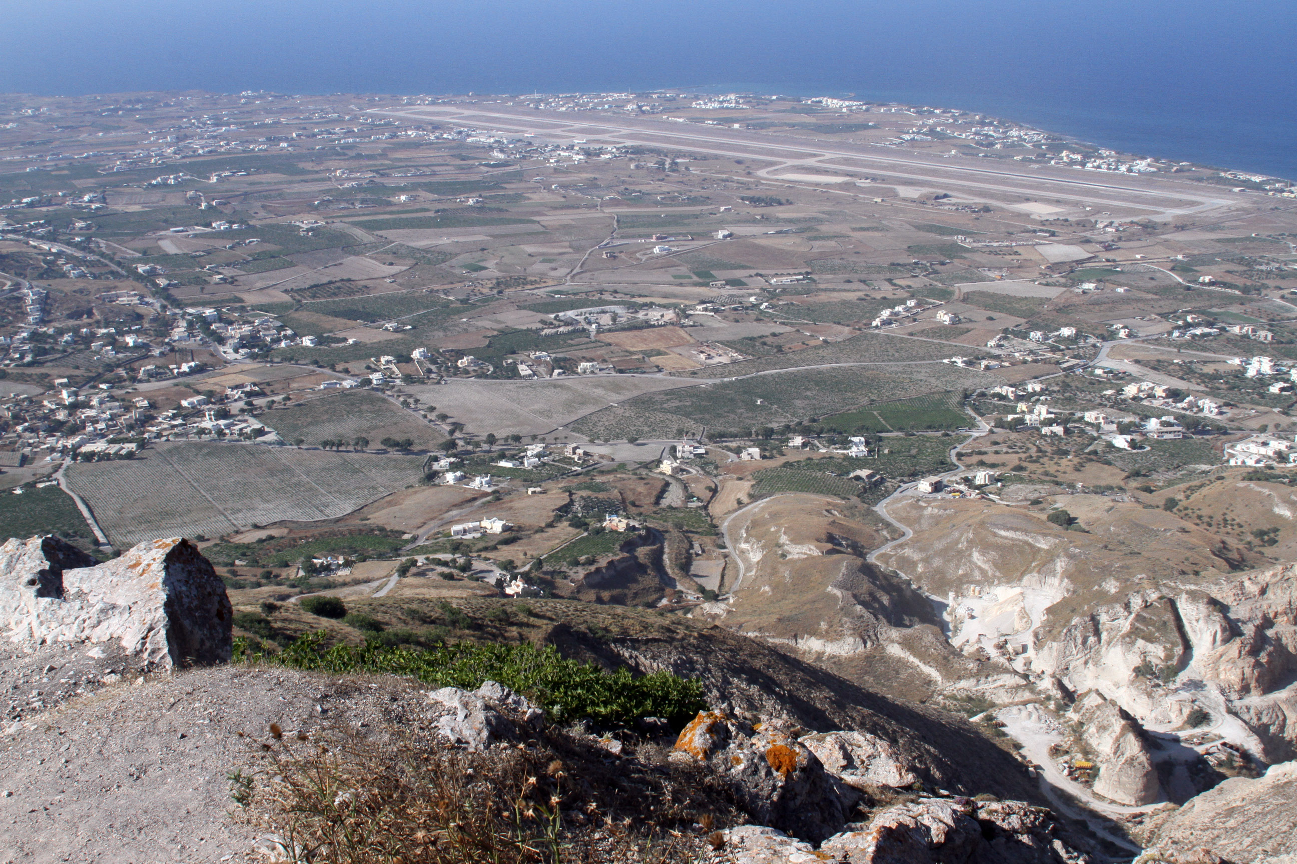 The ship anchored in the middle of the caldera near the main island of Santorini (Thera). A short ferry ride brought us to a dock where busses then transported us up, around, up, around, and up some more to the top of the cliff where we began our tour. Along the way around the island we went up to the highest point to get a view of the flat lands below. It was pretty large and there were lots of farms and white buildings everywhere. We finally made it to the town Oia where we walked up and down the narrow streets and stairs to see the buildings and views.IMG_3673