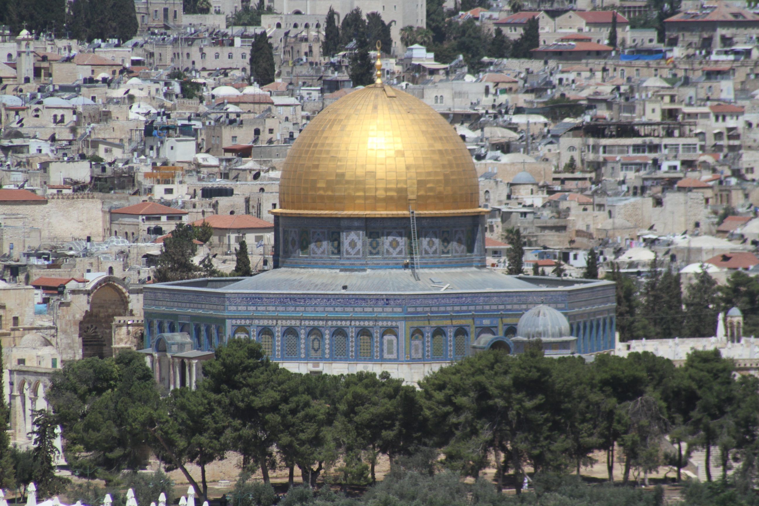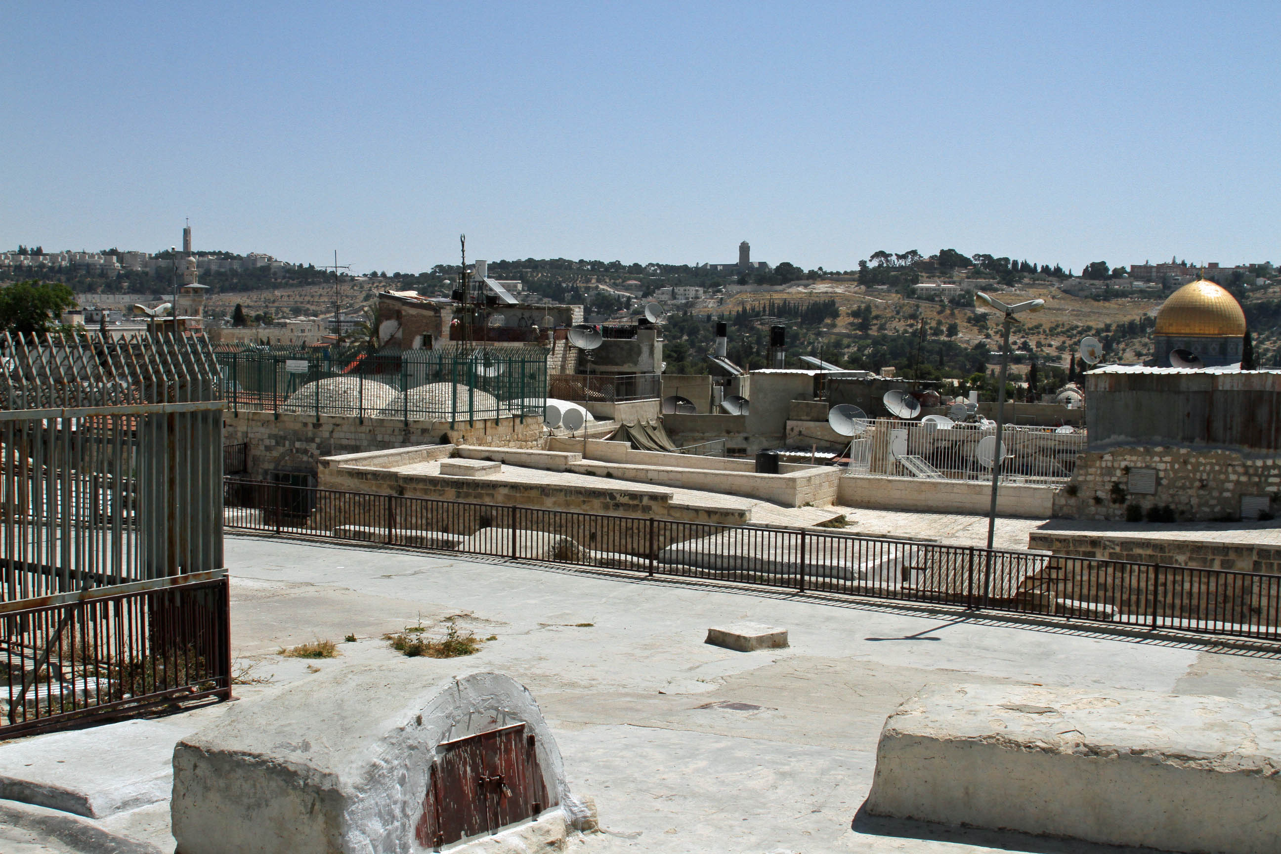 In Jesus’ time the location of the crucifixion and burial was outside the city walls. Back around 300 AD, Emperor Constantine’s mother decided these sites were located in the place that is now the Church of the Holy Sepulcher which houses the crucifixion rock, the place where His body was prepared for burial and the tomb where He was buried. The church is run by six different orthodox churches, each having a space in the church. Some in-fighting led to some interesting rules that were put in effect by the Muslims who were in charge of the city in the mid-1800s. One of the rules was “status quo” meaning everything that was in place at that time was to be kept exactly where it is forever. An interesting result is a ladder outside a second floor window used to help the monks get food and supplies during a siege is now forever in place as part of the façade. Another interesting fact is that a Muslim family holds the keys to the church and every morning one of the family members who has been named custodian, opens the doors.