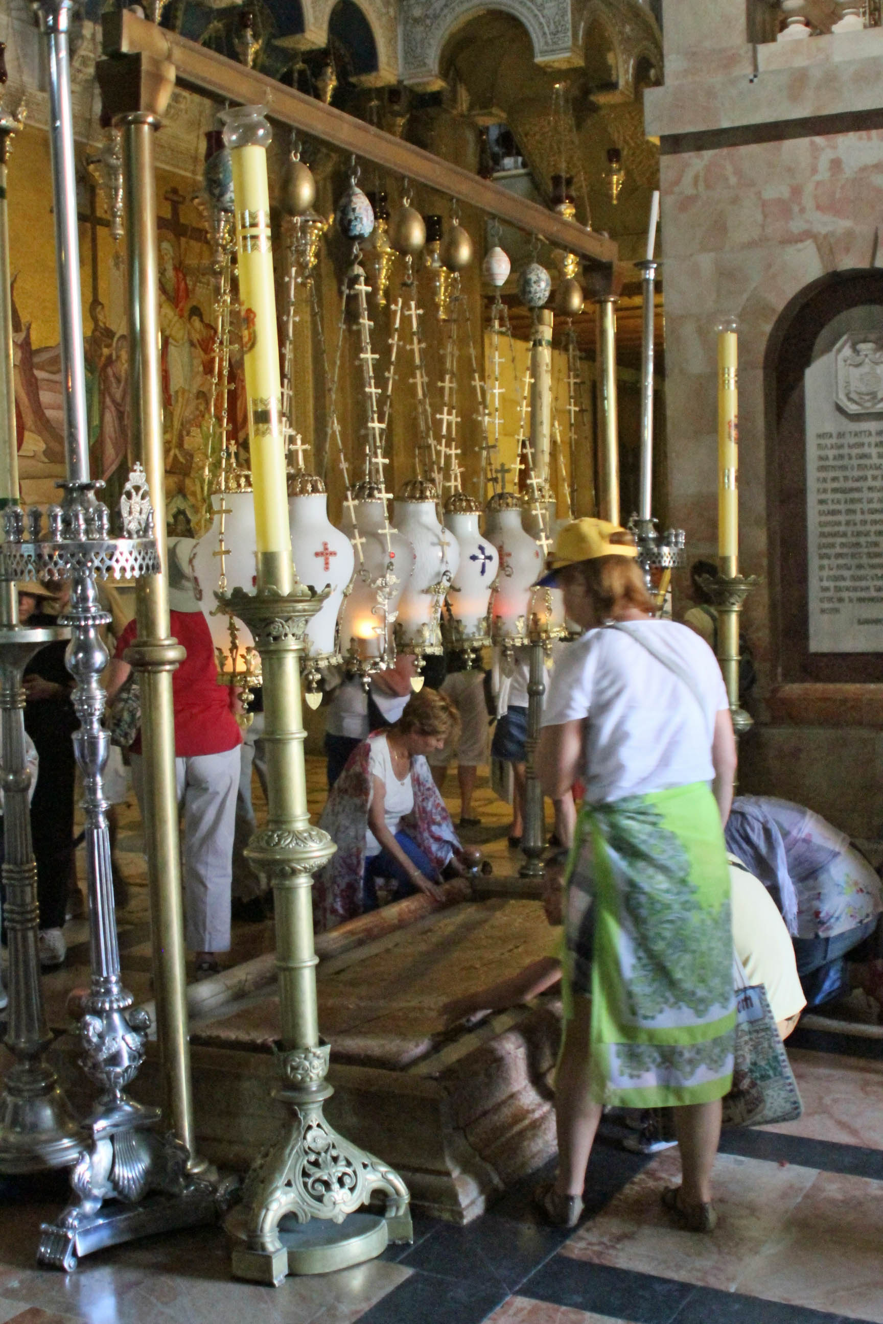 The place of Jesus’ anointing located next to rock of crucifixion in the Church of the Holy Sepulcher.